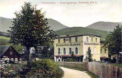 Den gleichen Weg geht es nun zurück bis zum Gerichtskretscham. Gegenüber an der Gerichtslinde führt der Weg in die Neuhäuser. So nannte man früher diesen Ortsteil an der Großen Lomnitz. Kurz vor der Lomnitz, rechter Hand, stand das bekannte Gasthaus "Deutscher Kaiser", später dann "Deutsches Haus" mit der Hausnummer 88. Fontane beweist in Briefen seine Ortskenntnis. Der "Deutsche Kaise" und seine "Environs" werden lebendig. Das Gasthaus wurde von den Polen nach 1945 abgerissen. Heute steht dort eine Pension.